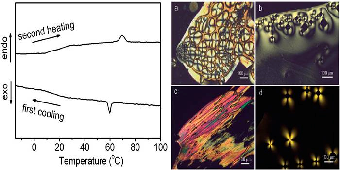 通過DSC可以十分方便地確定液晶材料的液晶溫度區(qū)間,這對(duì)于液晶材料的應(yīng)用具有十分重要的意義。該作者利用DSC,冷卻樣品之后再加熱,發(fā)現(xiàn)所研究對(duì)象在玻璃態(tài)轉(zhuǎn)化之后進(jìn)入液晶區(qū)間,直到60℃后完全轉(zhuǎn)化為各向同性的液體(文獻(xiàn):Chem. Commun. 2009, 5269-5271.)。