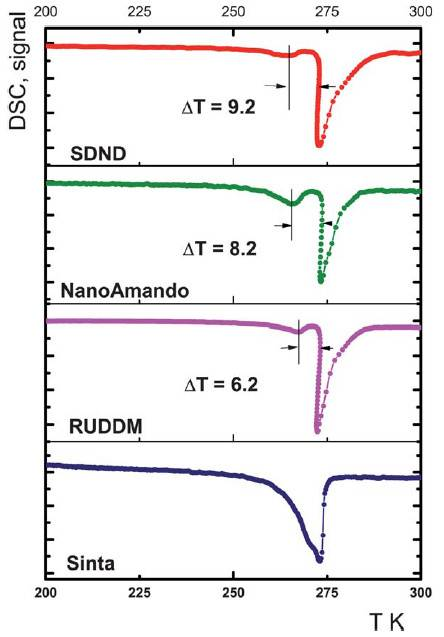 2013年Nanoscale上一篇文獻(xiàn)(Nanoscale, 5(4), 1529-1536.)報(bào)道,合成納米鉆石的前驅(qū)體中不僅含有自由的水分子,而且其孔道中還包含有納米水團(tuán),這兩種水在DSC中會(huì)出現(xiàn)不同的熔化峰。研究表明這兩種水的熔點(diǎn)差異(△T)可以用于判斷前驅(qū)體的分散性,作者表明這是其他的常規(guī)表征手段所無法做到的。