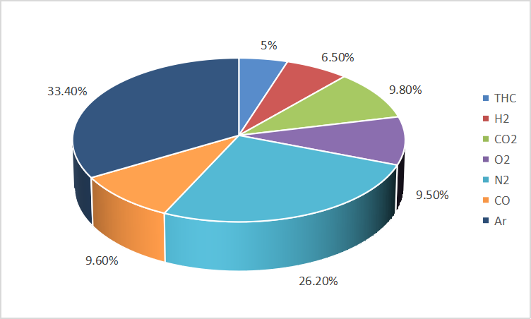 在本案例中,采用國(guó)內(nèi)某廠(chǎng)家50A·h、100%SOC的三元鋰電池,使用大型電池絕熱量熱儀(仰儀科技BAC-420A型)在惰性氣體氛圍中完成電池?zé)崾Э貙?shí)驗(yàn)。隨后對(duì)電池產(chǎn)氣進(jìn)行收集,并利用氣相色譜對(duì)氣體成分進(jìn)行分析,結(jié)果如下圖所示: