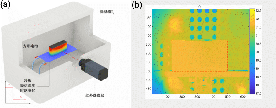 圖3 (a)測量系統(tǒng)結(jié)構(gòu)示意圖; (b)電池最大面溫度場演變過程示意圖
