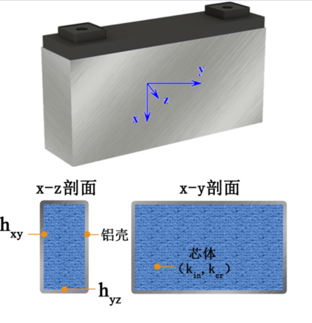 為了在不改變電池傳熱規(guī)律的前提下簡化計算,如圖2所示,可將方形電池簡化為金屬外殼和內(nèi)部芯片兩部分組成的非均質(zhì)等效模型。其中芯體熱特性為正交各向異性;殼體為均質(zhì),且已知其熱物性參數(shù)。