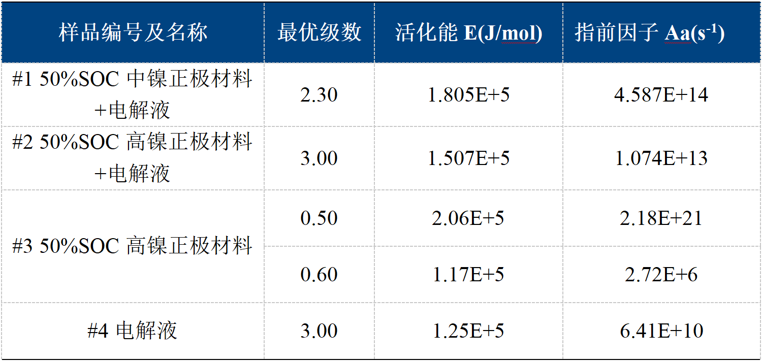 本文利用絕熱加速量熱儀經(jīng)典的HWS模式測定了電池材料的熱分解反應(yīng)特征參數(shù),并基于阿倫尼烏斯方程擬合得到了反應(yīng)動力學參數(shù)。相關(guān)結(jié)果有助于電池設(shè)計和系統(tǒng)熱仿真,改進電池系統(tǒng)的熱安全性能。