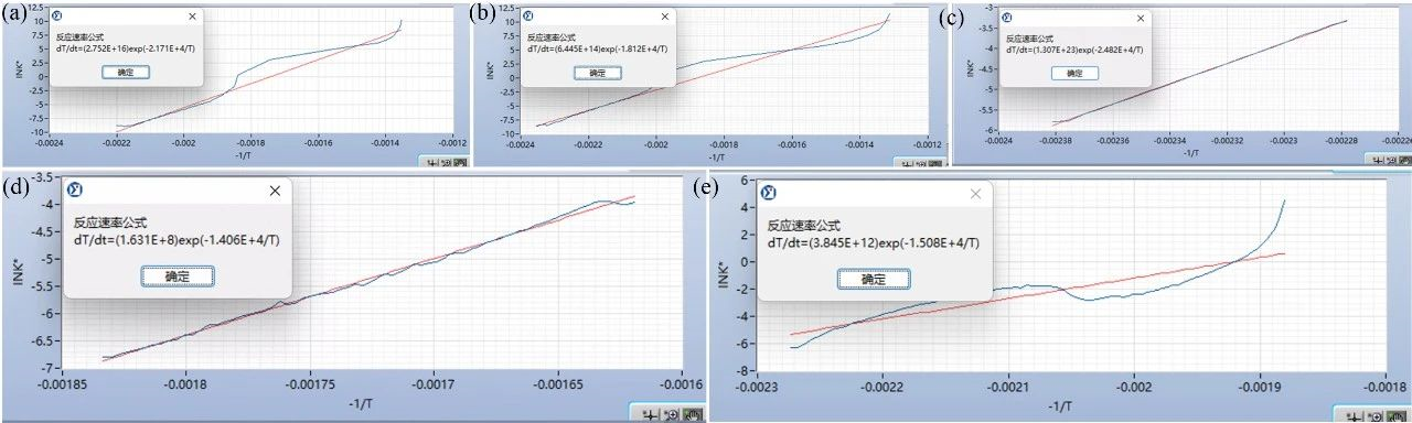 圖5 (a) 50%SOC中鎳正極材料&電解液混合物、(b) 50%SOC高鎳正極材料&電解液混合物、(c,d) 50%SOC高鎳正極材料以及(e) 電解液的熱分解反應(yīng)動力學擬合結(jié)果