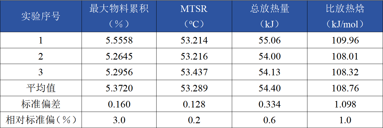 根據(jù)上述數(shù)據(jù),3次丙二酸二乙酯水解實(shí)驗(yàn)的比放熱焓標(biāo)準(zhǔn)偏差為1.0%,證明量熱結(jié)果具有良好的一致性;同時(shí)與文獻(xiàn)對比,量熱結(jié)果的可信度高。因此,丙二酸二乙酯水解反應(yīng)適合作為標(biāo)準(zhǔn)反應(yīng)體系開展量熱儀整體性能評價(jià)。根據(jù)實(shí)驗(yàn)結(jié)果,建議反應(yīng)比放熱焓參考值為109±2 kJ/mol。