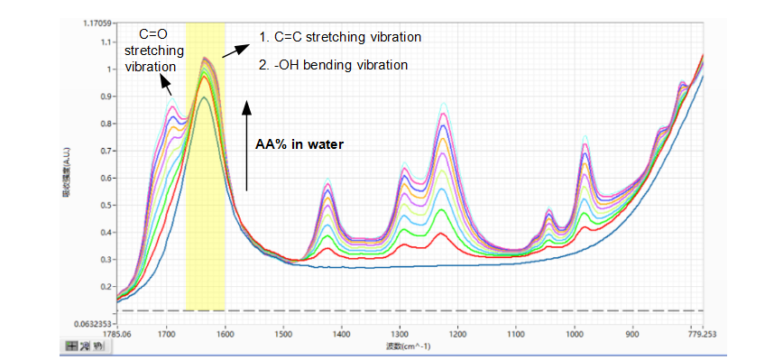 原位衰減全反射傅里葉變換紅外光譜(in-situ ATR-FTIR)目前已成功應用于自由基聚合、陰離子聚合和陽離子聚合等聚合反應研究,主要通過測定反應過程中碳碳雙鍵等特征基團的吸光度變化建立定量模型,計算單體濃度和轉化率[1,5,6]。然而該方法并不適用于半間歇式水相聚合體系,以聚丙烯酸(PAA)的水相溶液聚合反應為例,為控制反應平穩(wěn)進行,工業(yè)生產(chǎn)中通常會將部分丙烯酸單體、引發(fā)劑和鏈轉移劑溶液同時以滴加方式投入聚合釜內。如圖1所示,水中的羥基在1650 cm-1附近的紅外吸收峰強度較大,而碳碳雙鍵在臨近位置的吸收峰相對較弱,由于半間歇反應過程中水的濃度也會相應變化,將水的純譜作為背景直接進行扣除將顯著影響單體紅外定量的準確性。