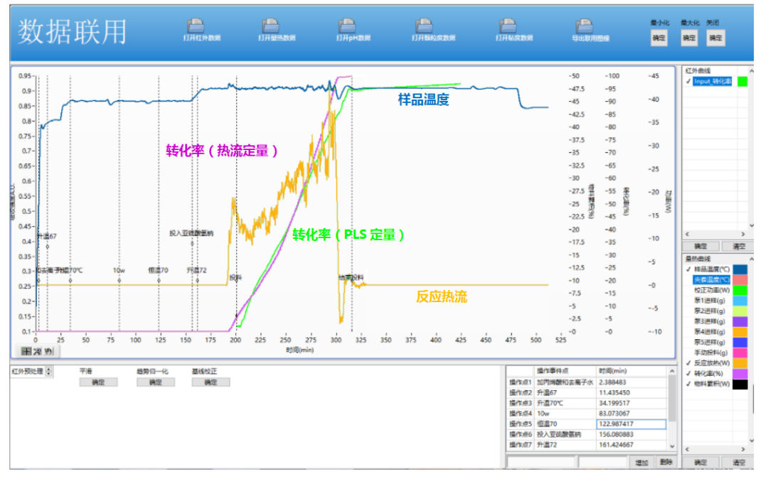 計算不同時刻PAA濃度與總濃度的比值可以得到丙烯酸單體轉化率曲線,單體的最終轉化率為92.3%。另外,利用ICPA平臺的在線量熱功能可以表征半間歇聚合反應的實時放熱情況,放熱熱流曲線間接反映了聚合速率變化。同時,通過計算累計的放熱量也可以得到反應轉化率曲線,本質上該曲線體現(xiàn)了聚合反應完成度變化,同樣可以表現(xiàn)反應的動力學特征。如圖4所示,通過數(shù)據(jù)聯(lián)用,可以發(fā)現(xiàn)紅外定量與量熱得到的反應轉化率曲線趨勢基本一致,可以相互印證上述兩種ICPA技術對于本案例動力學研究的適用性與準確性。除水相溶液聚合反應外,本文介紹的方法同樣適用于其他水相反應體系,可降低或消除水對目標物質定量分析的干擾。