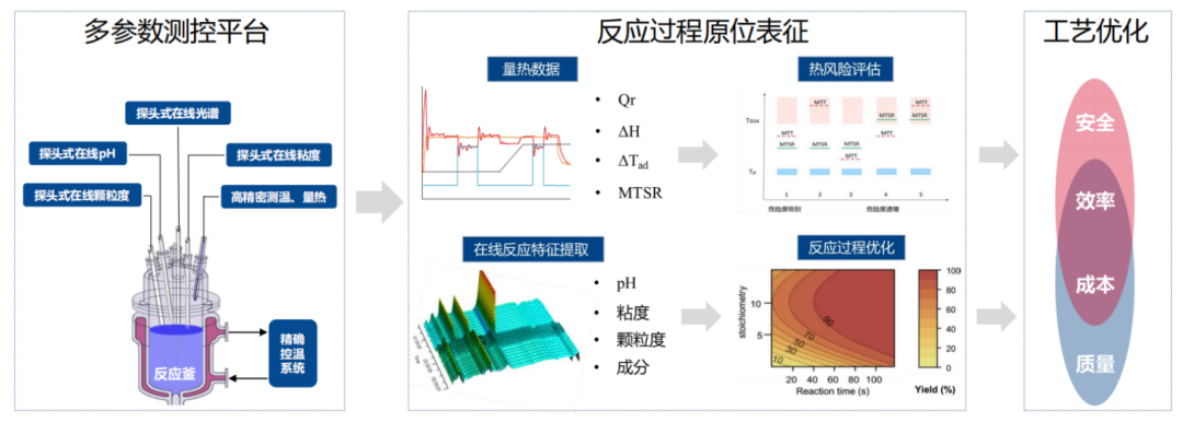 在上文提到的原料藥開發(fā)過程中,如果我們能夠在合成反應(yīng)過程中對(duì)反應(yīng)特征參數(shù)進(jìn)行實(shí)時(shí)監(jiān)測無疑能夠幫助研究人員更快、更好地進(jìn)行工藝開發(fā)和優(yōu)化。原位表征和過程分析(ICPA)平臺(tái)集成了功能強(qiáng)大的原位、實(shí)時(shí)測試能力。例如,可以通過在線分子光譜儀實(shí)時(shí)分析反應(yīng)體系的組分信息及含量變化;可以利用在線粘度計(jì)、在線顆粒度、在線PH計(jì)等儀器測定體系粘度、顆粒度和PH值等參數(shù)變化;利用反應(yīng)量熱儀測定反應(yīng)放熱速率、絕熱溫升、物料累積等熱安全數(shù)據(jù)。上述測試手段和數(shù)據(jù)將幫助試驗(yàn)人員進(jìn)行反應(yīng)過程分析、機(jī)理研究和風(fēng)險(xiǎn)評(píng)估,并從安全、質(zhì)量、成本等維度快速、高效地進(jìn)行原料藥合成工藝優(yōu)化。