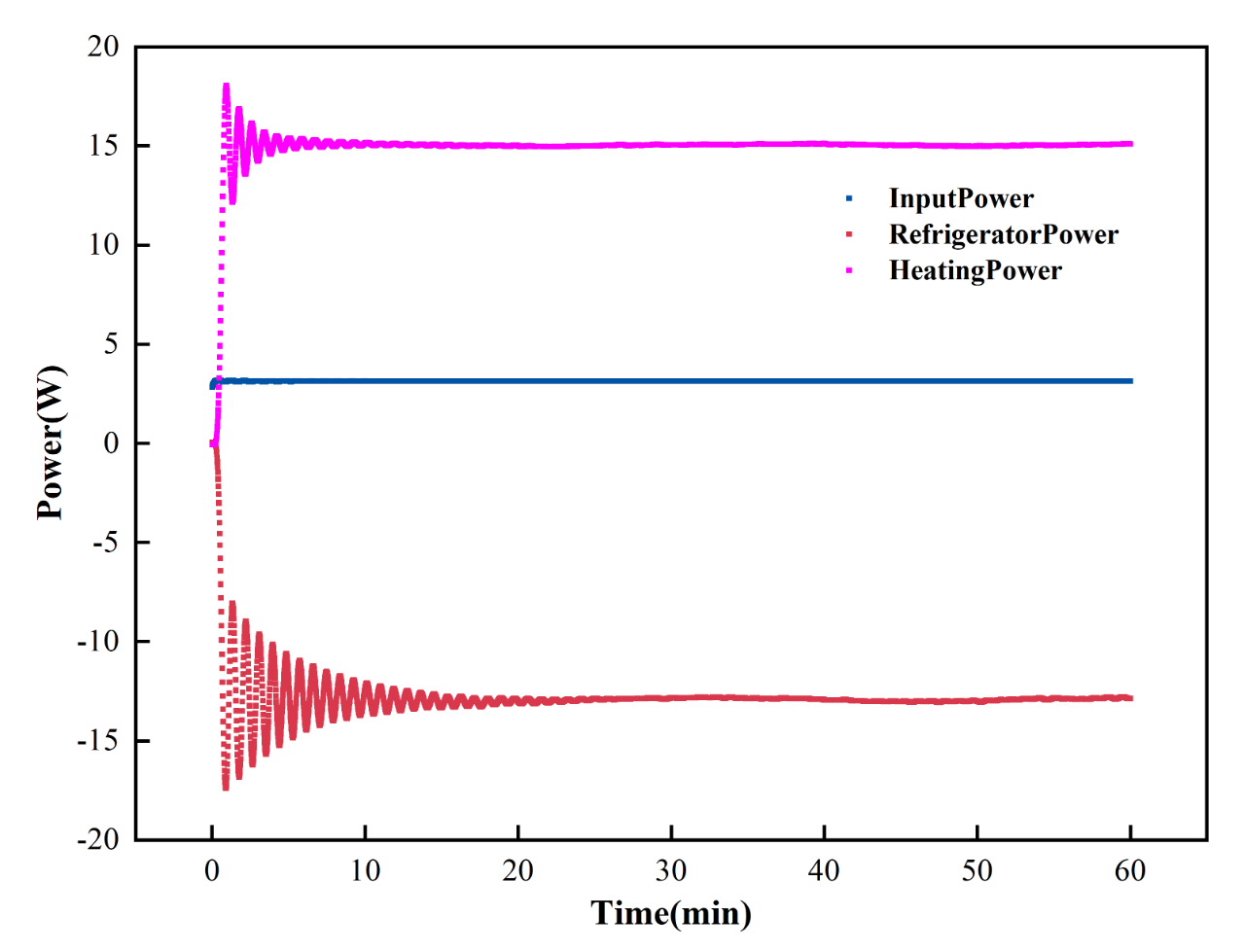25℃恒流1A條件下TEC輸入和輸出功率-時間曲線如圖4所示,TEC在恒溫恒流工況下,輸入功率較為穩(wěn)定,輸出功率(制熱功率及制冷功率)在短暫的波動后也趨于穩(wěn)定。