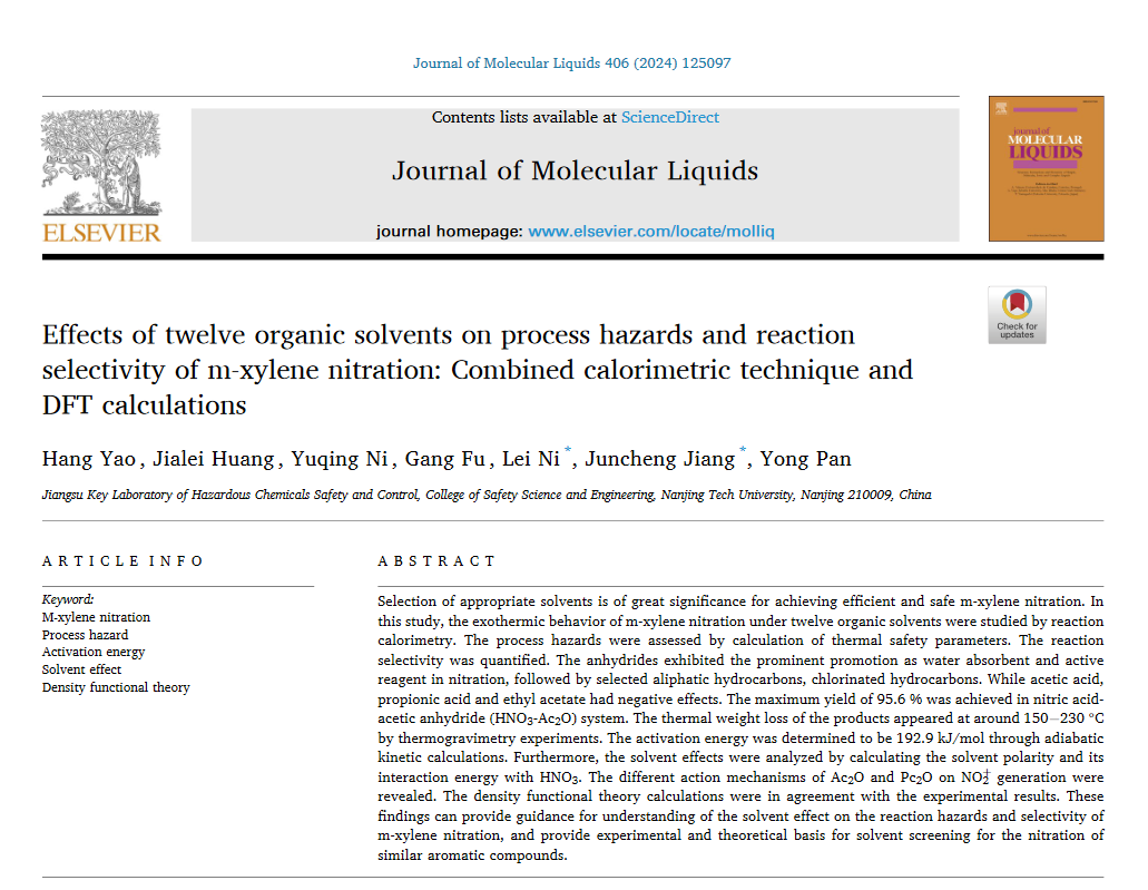 南京工業(yè)大學倪磊教授團隊在Journal of Molecular Liquids期刊發(fā)表論文《Effects of twelve organic solvents on process hazards and reaction selectivity of m-xylene nitration: Combined calorimetric technique and DFT calculations》,該成果由國家自然科學基金項目(No. 21927815, 52334006, 52274209)等支持。