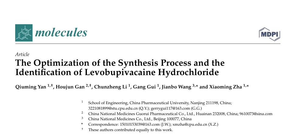 中國藥科大學(xué)工學(xué)院查曉明教授團(tuán)隊(duì)在Journal | [J] Molecules(IF:4.2)發(fā)表題為The Optimization of the Synthesis Process and the Identification of Levobupivacaine Hydrochloride論文,該成果由中國藥科大學(xué)工學(xué)院、國藥集團(tuán)國瑞藥業(yè)有限公司及中國民族醫(yī)藥股份有限公司等機(jī)構(gòu)聯(lián)合支持。