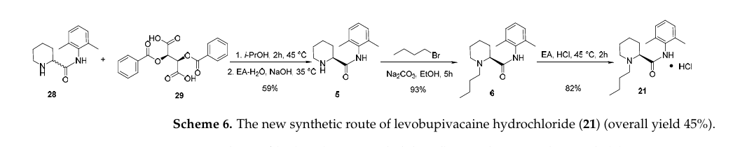 本研究從起始原料的可用性和成本效益、操作簡便性、綠色環(huán)保、設(shè)備可及性、工業(yè)化可行性、優(yōu)化的手性合成和安全性等維度考慮,優(yōu)化和改進(jìn)了一種更可行的鹽酸左布比卡因(21)合成工藝(Scheme 6),這種新方法能克服現(xiàn)有方法的復(fù)雜性和高成本,有利于促進(jìn)大規(guī)模工業(yè)化生產(chǎn)。