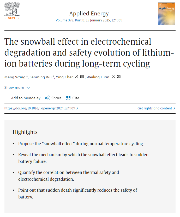 華東理工大學欒偉玲教授團隊在Applied Energy(IF:11)發(fā)表題為《The snowball effect in electrochemical degradation and safety evolution of lithium-ion batteries during long-term cycling》的研究論文,該成果由華東理工大學先進電池系統(tǒng)與安全重點實驗室(CPCIF)、機械與動力工程學院等機構聯合支持。