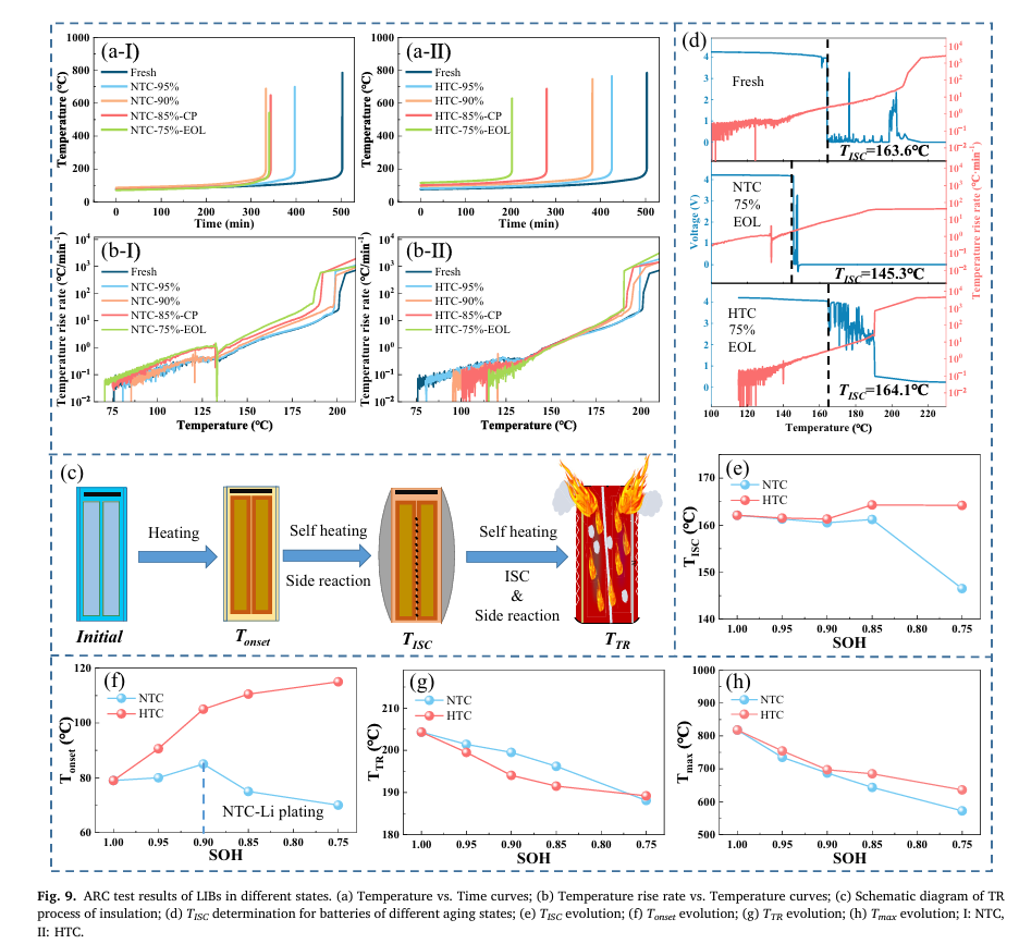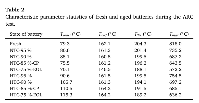 本研究采用小型電池絕熱量熱儀BAC-90A對在不同退化路徑下老化至特定狀態(tài)的電池進行絕熱熱失控測試。獲取了自發(fā)熱起始溫度(Tonset)、內部短路觸發(fā)溫度(TISC)、熱失控起始溫度(TTR)和熱失控最高溫度(Tmax)四個熱失控特征參數。結果表明高溫循環(huán)和常溫循環(huán)老化過程中的熱失控特性存在顯著差異。