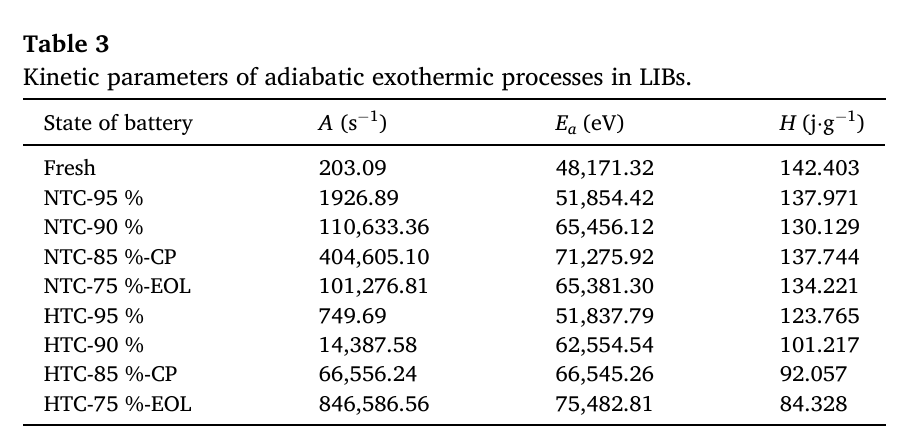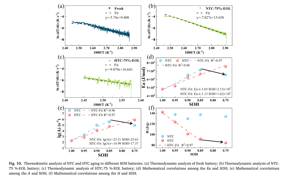 為進一步分析老化引起的電池熱安全性變化,該研究結合小型電池絕熱量熱儀BAC-90A的測試結果對電池絕熱溫升過程進行了動力學分析。結合dT/dt特性曲線,采用Arrhenius等方程計算,獲取了常溫循環(huán)和高溫循環(huán)條件下不同老化狀態(tài)電池的放熱反應動力學參數。揭示了活化能Ea與電池SOH之間的關系。結果表明,對于高溫循環(huán)和常溫循環(huán)的線性老化階段,Ea值隨著SOH的降低而單調遞增。