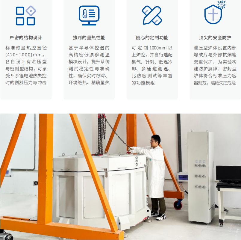 為適應(yīng)鋰電池單體向大體積與高比能量發(fā)展的趨勢(shì),仰儀科技推出全球首創(chuàng)的BAC系列全尺寸超大型電池絕熱量熱儀,系列定制型號(hào)量熱腔直徑可達(dá)1000mm以上。仰儀科技BAC系列全尺寸大型電池絕熱量熱儀可針對(duì)長邊≤1500mm范圍內(nèi)的電芯開展安全、精準(zhǔn)、可靠的絕熱熱失控測(cè)試。與目前國內(nèi)外廠家的標(biāo)準(zhǔn)產(chǎn)品相比,BAC系列具有更大的量熱腔容量、更高的安全防護(hù)和更豐富的測(cè)試功能。電池絕熱量熱儀可用于大容量和大尺寸電池單體熱穩(wěn)定性測(cè)試、熱失控電池產(chǎn)氣測(cè)試、材料熱安全性測(cè)試、充放電產(chǎn)熱測(cè)試、熱物性參數(shù)等關(guān)鍵數(shù)據(jù)的測(cè)量,為鋰電池?zé)岚踩蜔峁芾硖峁┛茖W(xué)的參考依據(jù)。