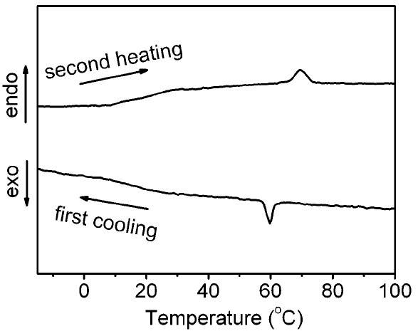 通過DSC可以十分方便地確定液晶材料的液晶溫度區(qū)間,這對(duì)于液晶材料的應(yīng)用具有十分重要的意義。該作者利用DSC,冷卻樣品之后再加熱,發(fā)現(xiàn)所研究對(duì)象在玻璃態(tài)轉(zhuǎn)化之后進(jìn)入液晶區(qū)間,直到60℃后完全轉(zhuǎn)化為各向同性的液體(文獻(xiàn):Chem. Commun. 2009, 5269-5271.)。