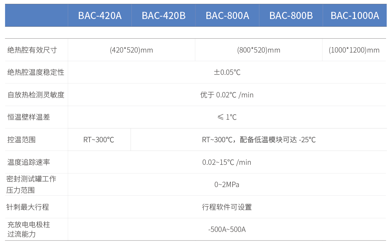 儀器性能方面,BAC系列可針對長邊≤1500mm范圍內(nèi)的電芯開展安全、精準(zhǔn)、可靠的絕熱熱失控測試。與目前國內(nèi)外廠家的標(biāo)準(zhǔn)產(chǎn)品相比,BAC系列大容量腔體的抗爆性和產(chǎn)氣測試能力顯著提升,能夠承受大型電芯的熱失控溫壓沖擊。