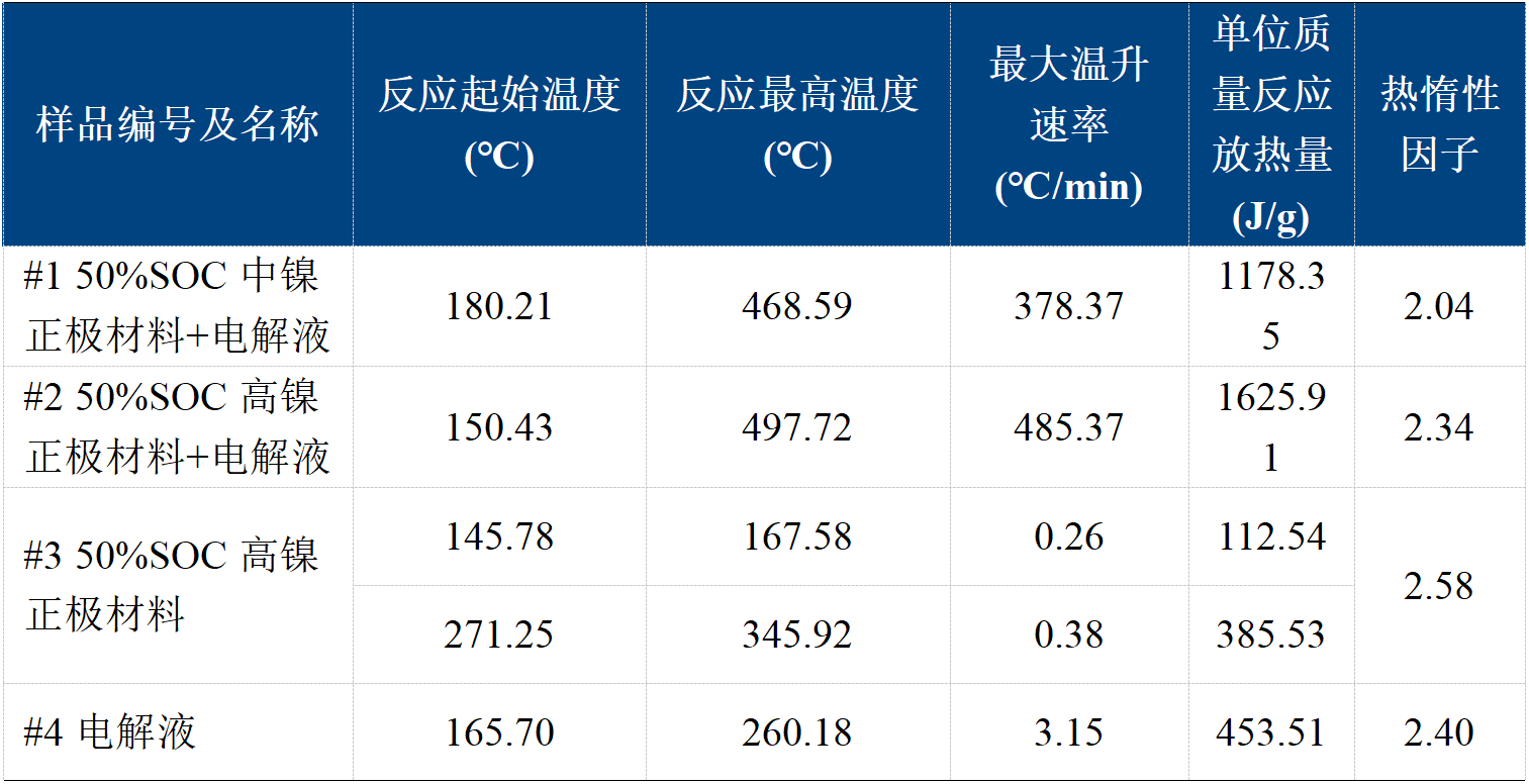 如圖4與表2所示,50%SOC中鎳正極材料&電解液混合物的自放熱起始溫度高于高鎳材料&電解液的數(shù)值,其反應(yīng)最高溫度和最大溫升速率低于高鎳材料&電解液的數(shù)值,證明高鎳正極的熱穩(wěn)定性相對較低。