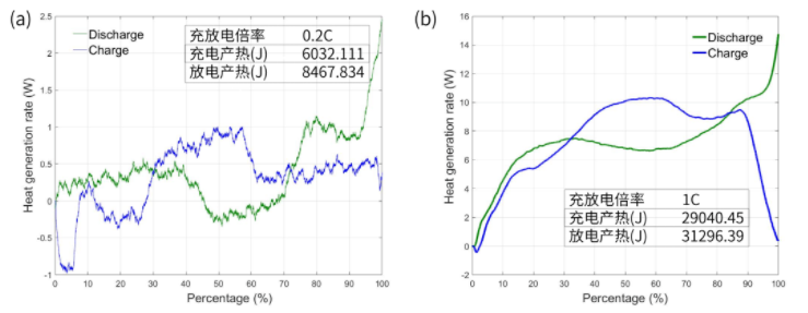 最后,利用50Ah軟包電池研究了倍率的影響。如圖3a所示,在0.2C倍率下,充放電曲線(xiàn)都存在吸熱區(qū)間,且兩條曲線(xiàn)具有明顯的對(duì)稱(chēng)性,說(shuō)明此時(shí)電池產(chǎn)熱以電極反應(yīng)熱為主,可逆熱占比很高;而在1C倍率下,充放電產(chǎn)熱充放電曲線(xiàn)對(duì)稱(chēng)性減弱,且未出現(xiàn)明顯的吸熱峰。這是由于在提高充放電倍率情況下,可逆反應(yīng)熱基本保持不變,但極化熱和焦耳熱等不可逆熱顯著提高。