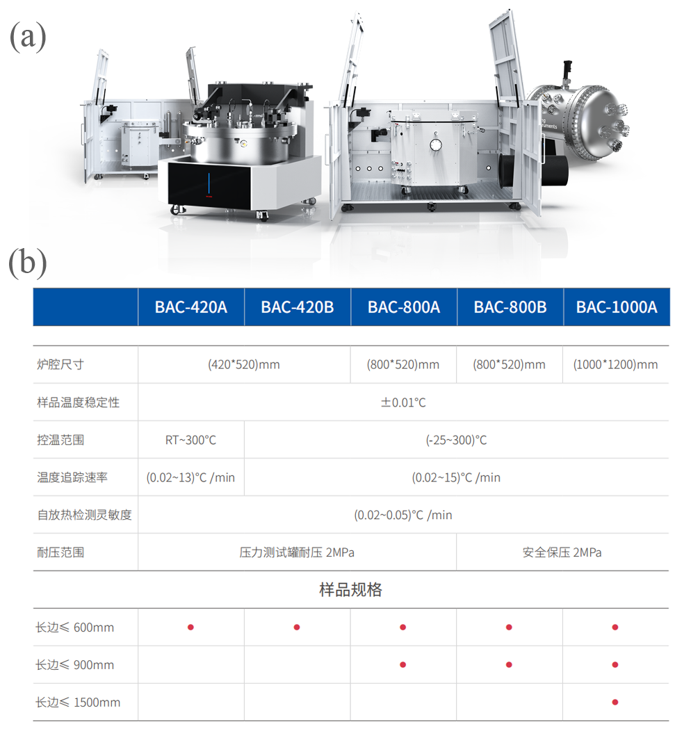 仰儀科技長期致力于鋰電池?zé)岚踩珯z測儀器和解決方案開發(fā),公司研制的BAC-420A大型電池絕熱量熱儀打破國外壟斷,已成功進(jìn)行了包括190Ah NCM811、230Ah NCM622、320Ah LPF和600mm短刀在內(nèi)的數(shù)百款電芯的絕熱熱失控和熱物性參數(shù)測試,積累了大量的儀器開發(fā)和應(yīng)用經(jīng)驗(yàn)。針對現(xiàn)有電池絕熱儀器的應(yīng)用限制,仰儀科技創(chuàng)新研發(fā)BAC系列全尺寸大型電池絕熱量熱儀,腔體直徑覆蓋420mm-1000mm的范圍,能夠測試長邊尺寸不超過1500mm的電芯;同時(shí),大容量腔體的抗爆性和產(chǎn)氣測試能力顯著提升,能夠承受大型電芯的熱失控溫壓沖擊。另外,考慮用戶差異化的使用習(xí)慣和測試需求,系列化產(chǎn)品兼顧了腔體開蓋泄壓和腔體密閉-定向泄壓兩種技術(shù)路線以供選擇。除常規(guī)熱濫用測試以外,BAC系列產(chǎn)品具備氣體收集和壓力測量、針刺模塊、視頻監(jiān)控、充放電測試、比熱容測試、氣氛模擬和低溫制冷等功能,可以對電池?zé)岚踩赃M(jìn)行全面評估。系列化儀器的核心參數(shù)如下圖所示: