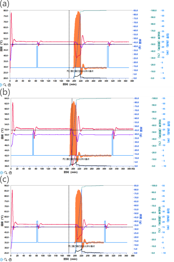 圖3 丙二酸二乙酯水解反應(yīng)(a)第一次、(b)第二次和(c)第三次實(shí)驗(yàn)放熱測量結(jié)果