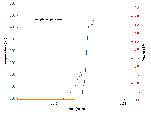 對圖2溫度數(shù)據(jù)及圖3產(chǎn)氣速率、產(chǎn)氣量數(shù)據(jù)進行分析后發(fā)現(xiàn),該電池?zé)崾Э厥謩×?,并且放大樣品溫度曲線可以發(fā)現(xiàn),整個熱失控過程從開始到結(jié)束持續(xù)不到3s,就完成了1300℃以上的溫升,溫升速率達到了200000℃/min以上。同時,觀察氣體數(shù)據(jù)可以發(fā)現(xiàn),在熱失控過程中最大產(chǎn)氣速率達到15000L/min以上,展現(xiàn)了鋰電池燃爆時極強的沖擊力。