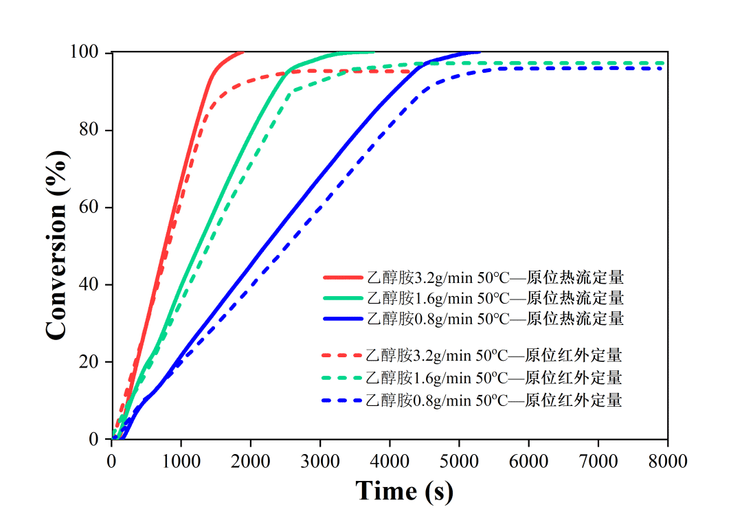 我們將通過紅外與在線量熱分別計算得到的轉化率曲線進行對比,可以發(fā)現(xiàn)兩者非常接近。可以認為前者代表了反應物轉化率變化,后者代表了反應完成度變化,均可以體現(xiàn)反應的動力學特征。理論上,化學反應轉化率越高,兩者的差異越小。