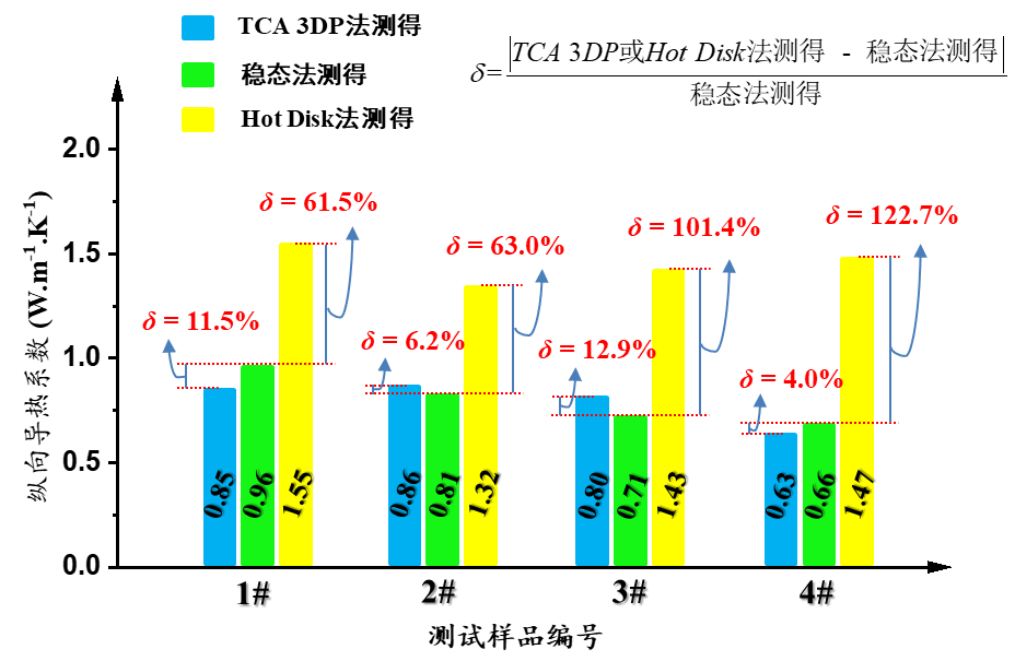 此外,為了驗證TCA 3DP和Hot Disk兩種方法的準確性,我們以穩(wěn)態(tài)法的測試結果作為參標,計算這兩種方法測定的縱向導熱系數(shù)與穩(wěn)態(tài)法的相對偏差,結果如圖4所示??梢钥闯?,TCA 3DP法測得的結果與穩(wěn)態(tài)法更為接近,相對偏差在4% ~ 11.5%之間,而Hot Disk法測得的結果與穩(wěn)態(tài)法差別較大,相對偏差在61.5% ~ 122.7%之間。因此,我們可以得出結論相比于Hot Disk法,TCA 3DP法測得的導熱系數(shù)更為準確。