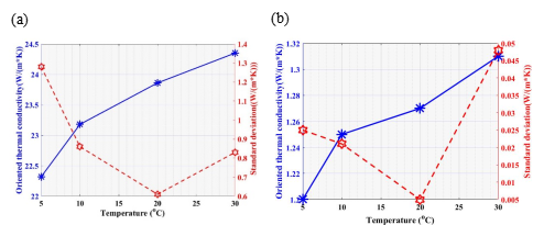 圖4 鋰電池的(a)面向與(b)縱向?qū)嵯禂?shù)與溫度關(guān)系圖