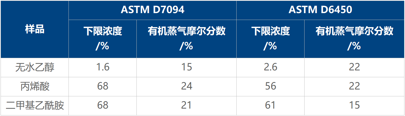 另外,ASTM D6450 和 ASTM D7094 兩種方法對于單一濃度閃點值的測試結(jié)果呈現(xiàn)較高的一致性,但在樣品量、加熱速率、空氣導入量等方面的差異導致測定的濃度下限存在一定區(qū)別(見圖 2 和表 1)。由于測試流程中蒸氣濃度累積至 LFL 是一個復雜的非線性、多因素耦合過程,濃度下限與檢測方法之間并沒有體現(xiàn)出很好的規(guī)律性。