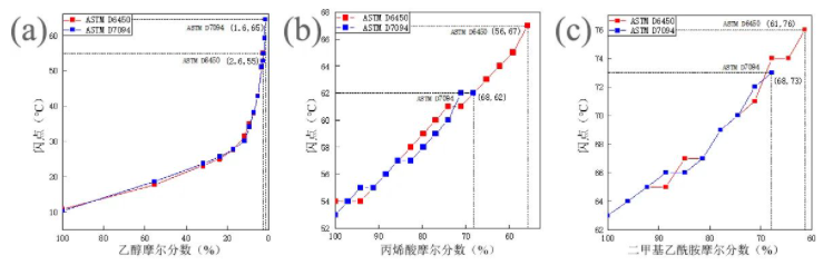 圖 1 (a)乙醇、(b)丙烯酸和(c)二甲基乙酰胺溶液閃點稀釋曲線